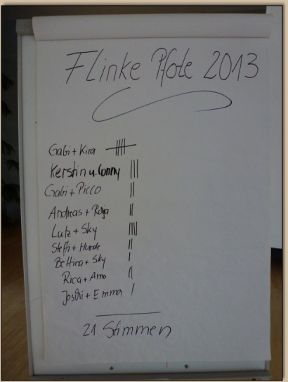 Dann plötzlich aber gab es die Wende, denn ein Wahlzettel, welcher aufgrund von unzureichender Zuordnungsmöglichkeit gleich zu Beginn als ungültig erklärt wurde, konnte durch das Outen des Ausfüllers nun doch noch zugeordnet werden. Die letzte Stimme gehörte demzufolge unserer Gabi, welche somit mit 5 Stimmen die Wahl der "Flinken Pfote 2013" gewann.